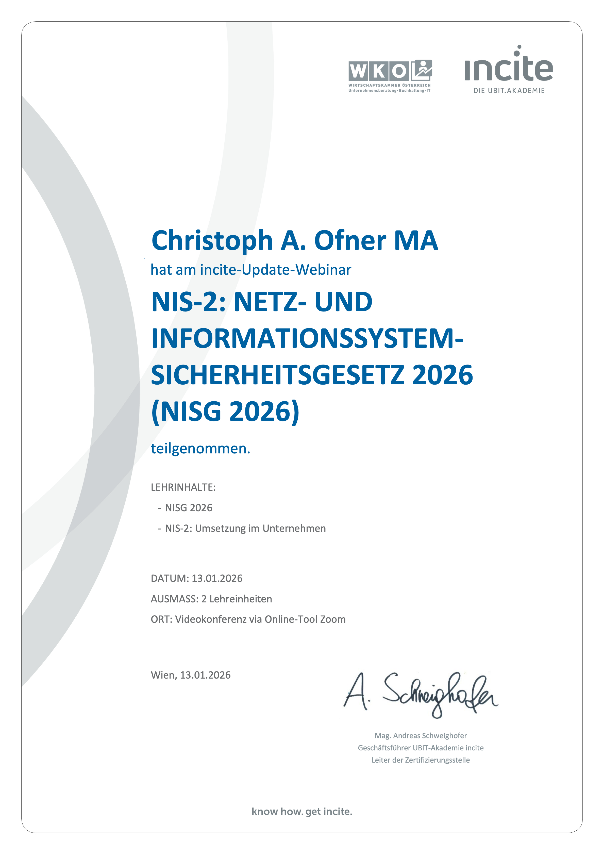 Ich habe soeben ein intensives Update-Webinar zur NIS-2-Umsetzung und zum NISG 2026 absolviert. Damit bin ich fachlich auf dem neuesten Stand, was die gesetzlichen Details und die praktische Implementierung im Betrieb angeht.
